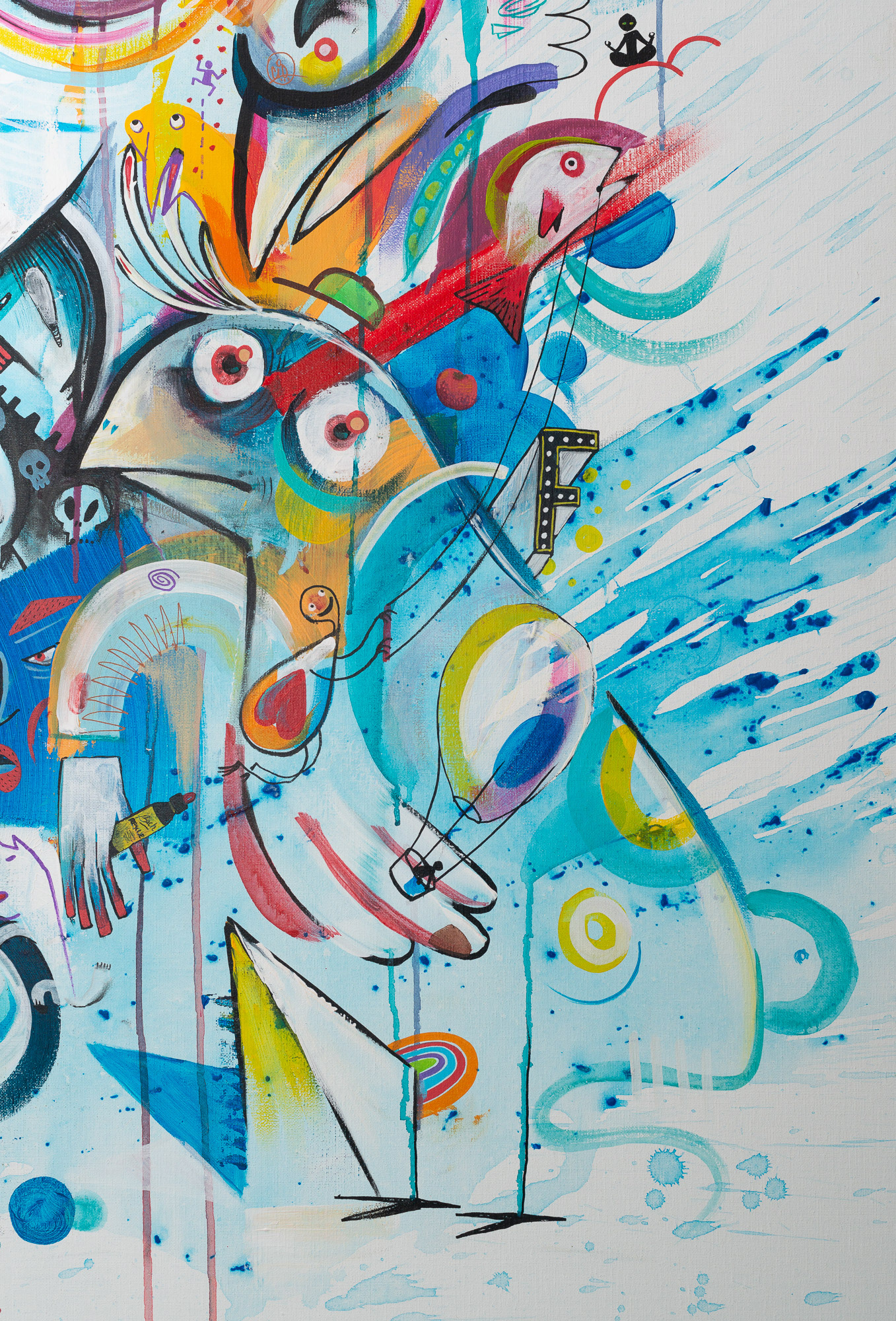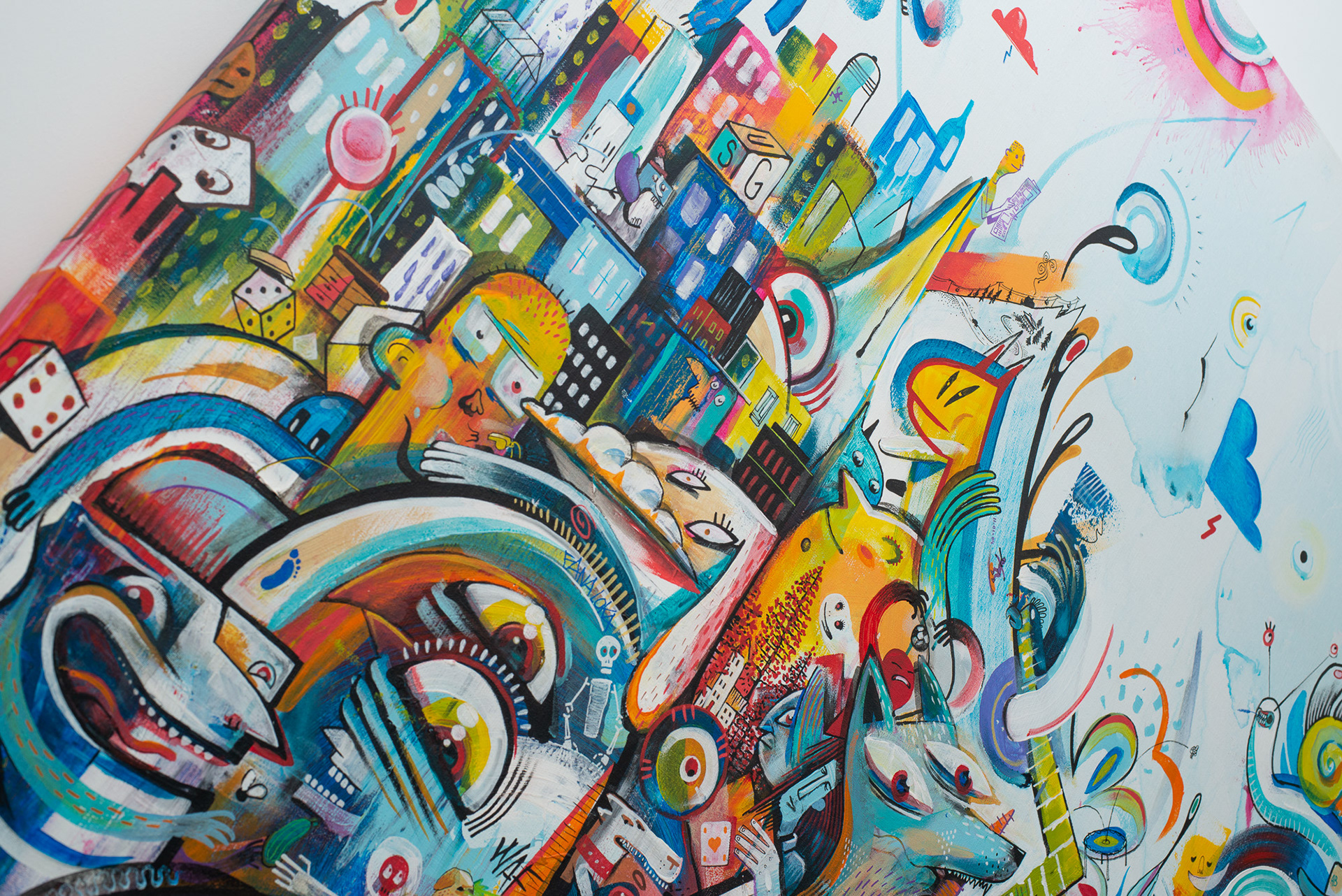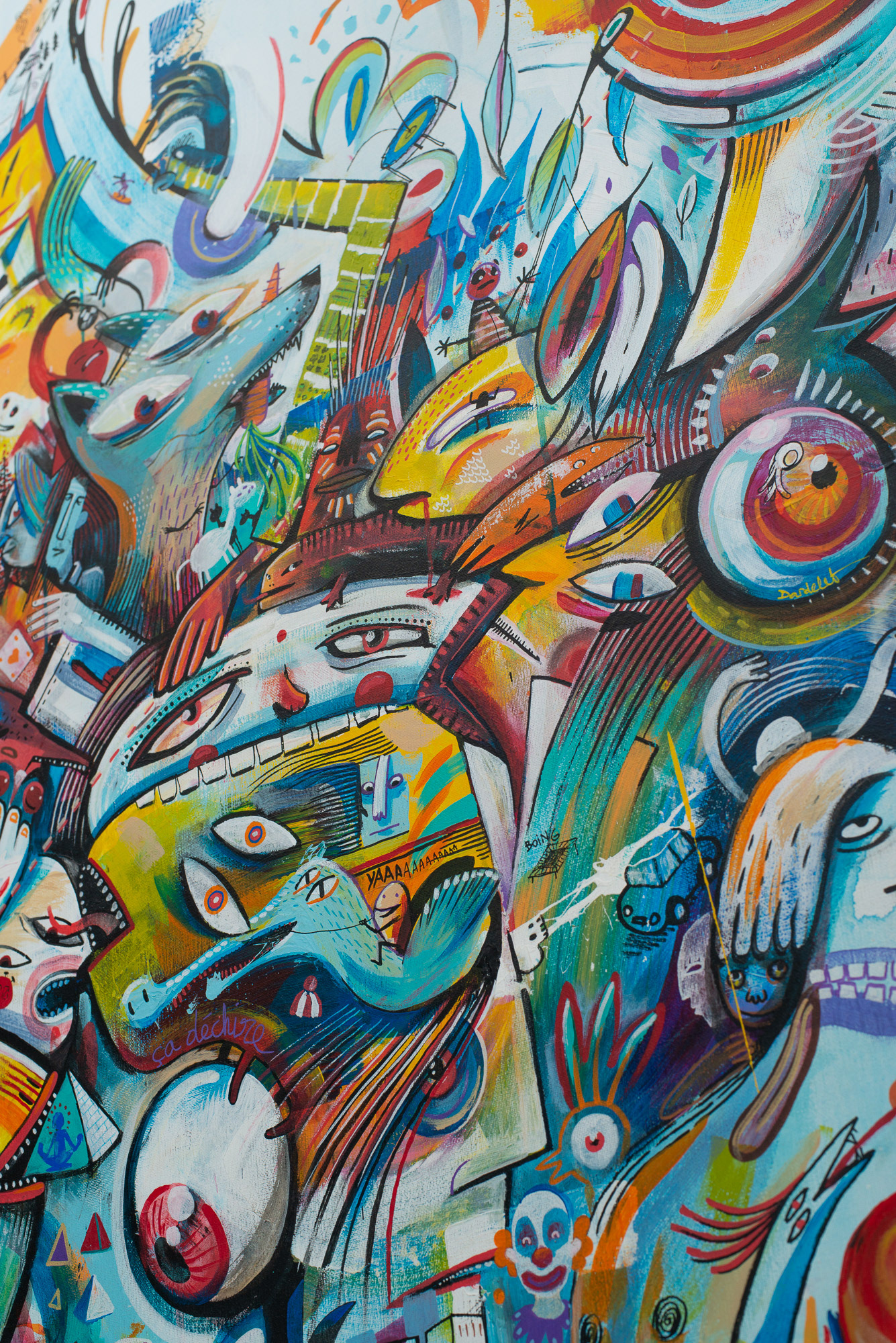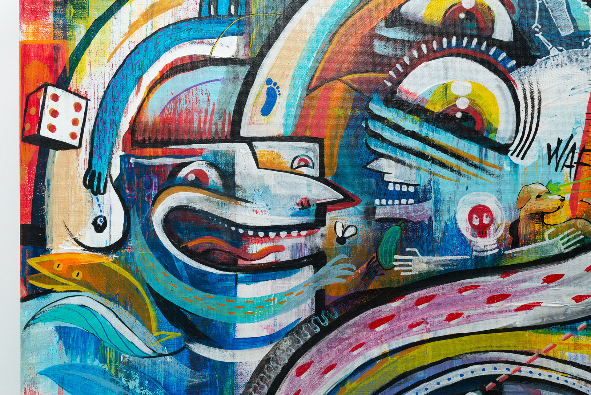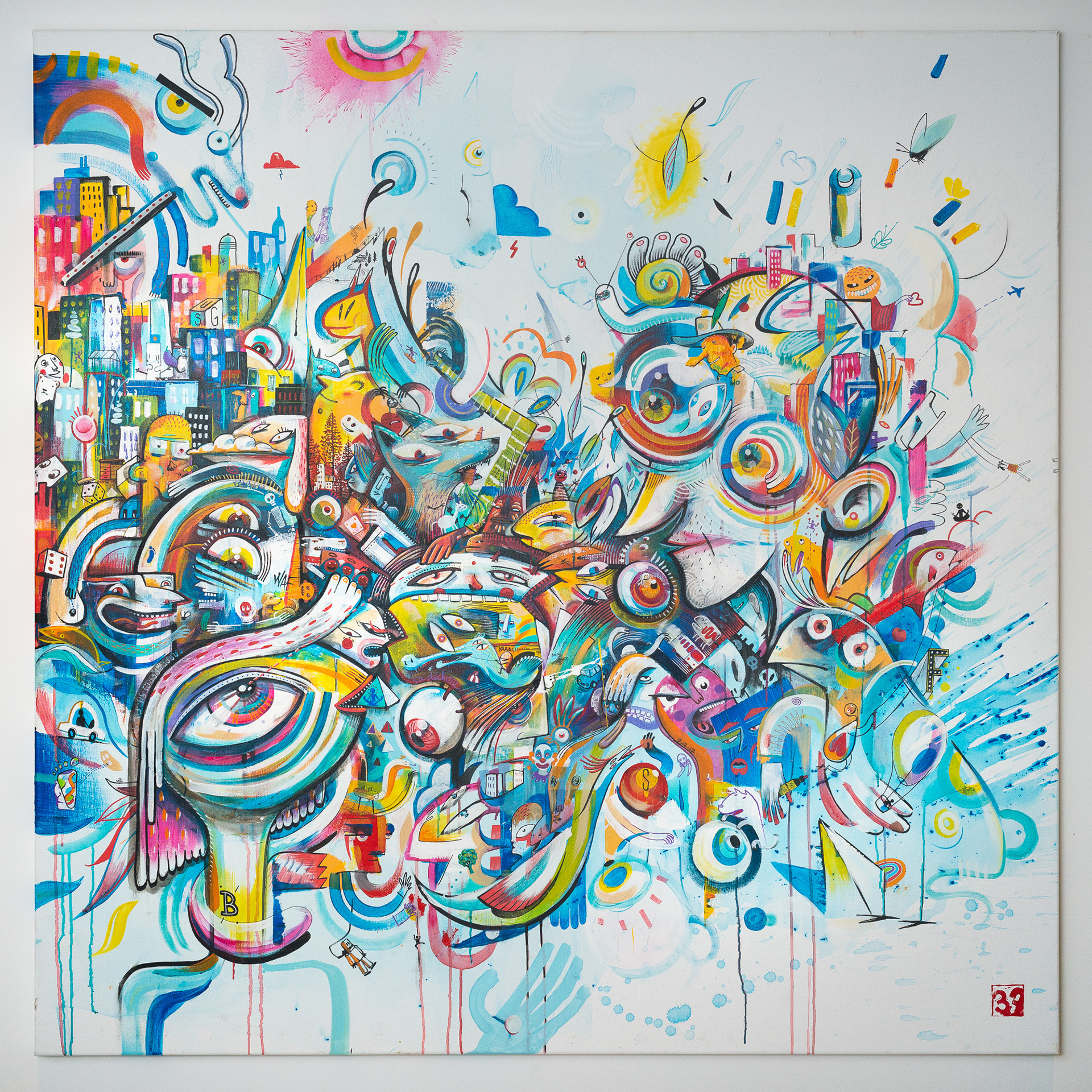 a mixed media artwork composed by three artists on a canvas 180/180cm