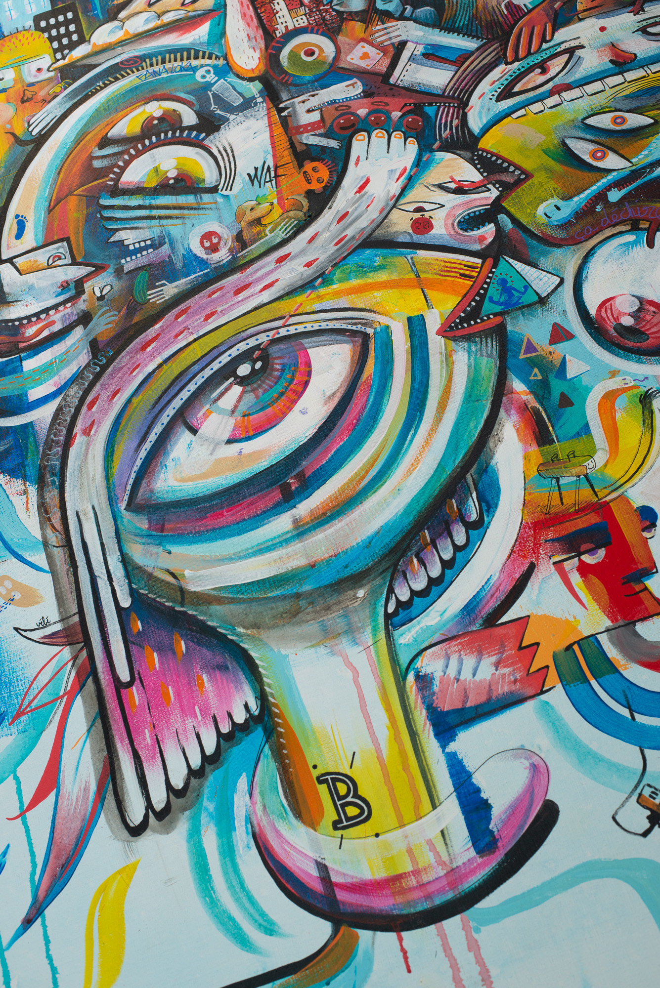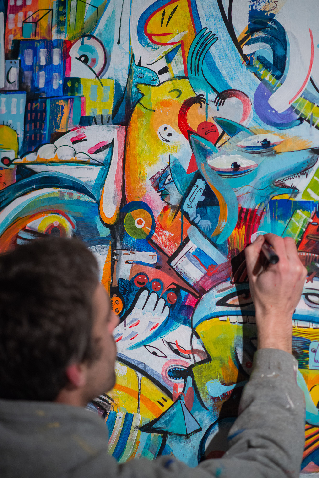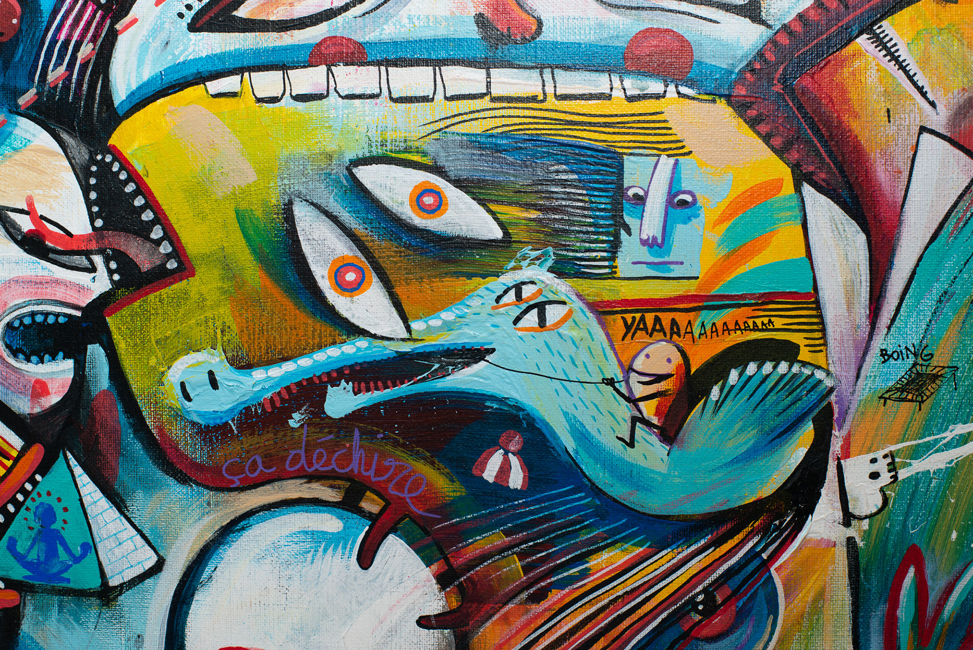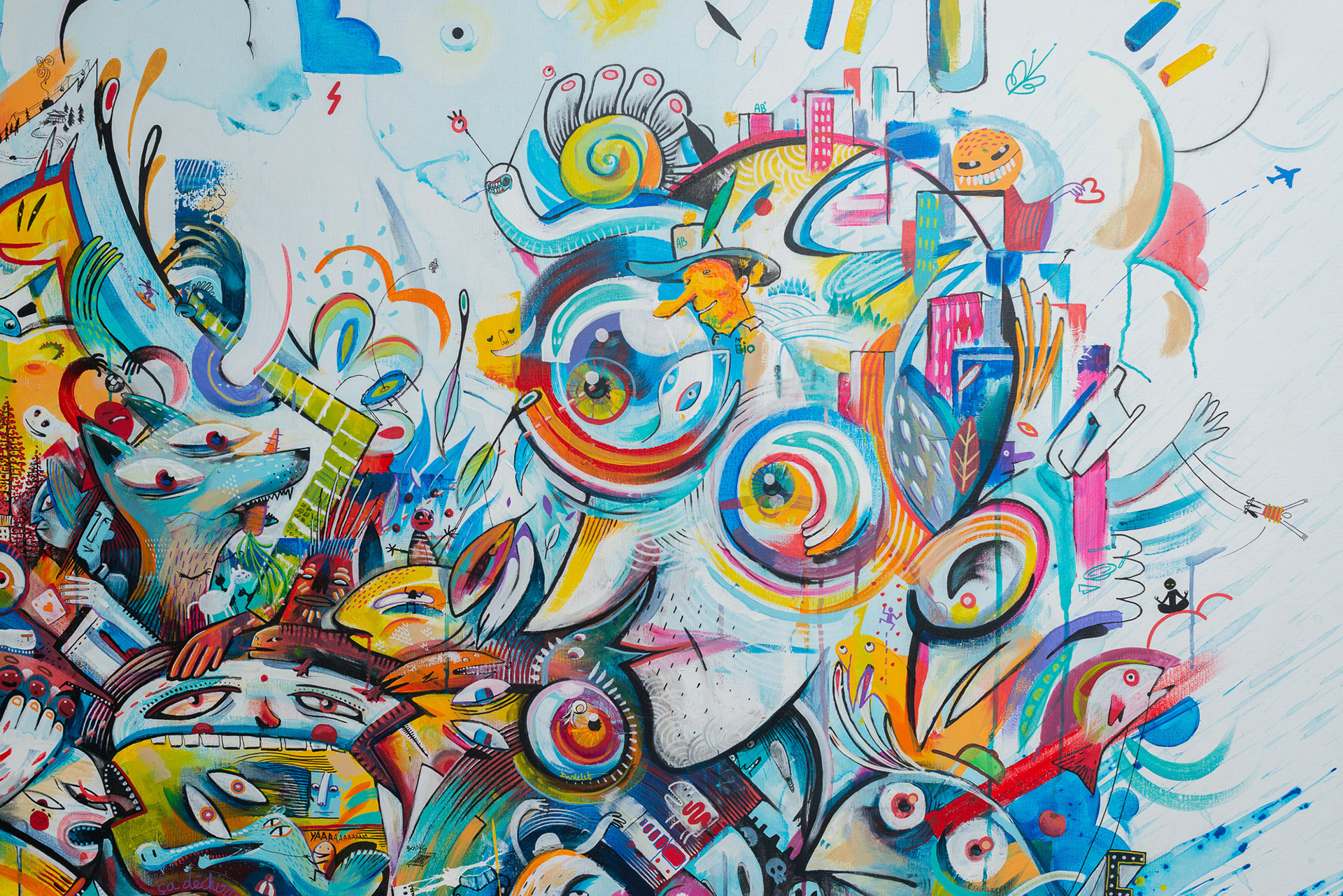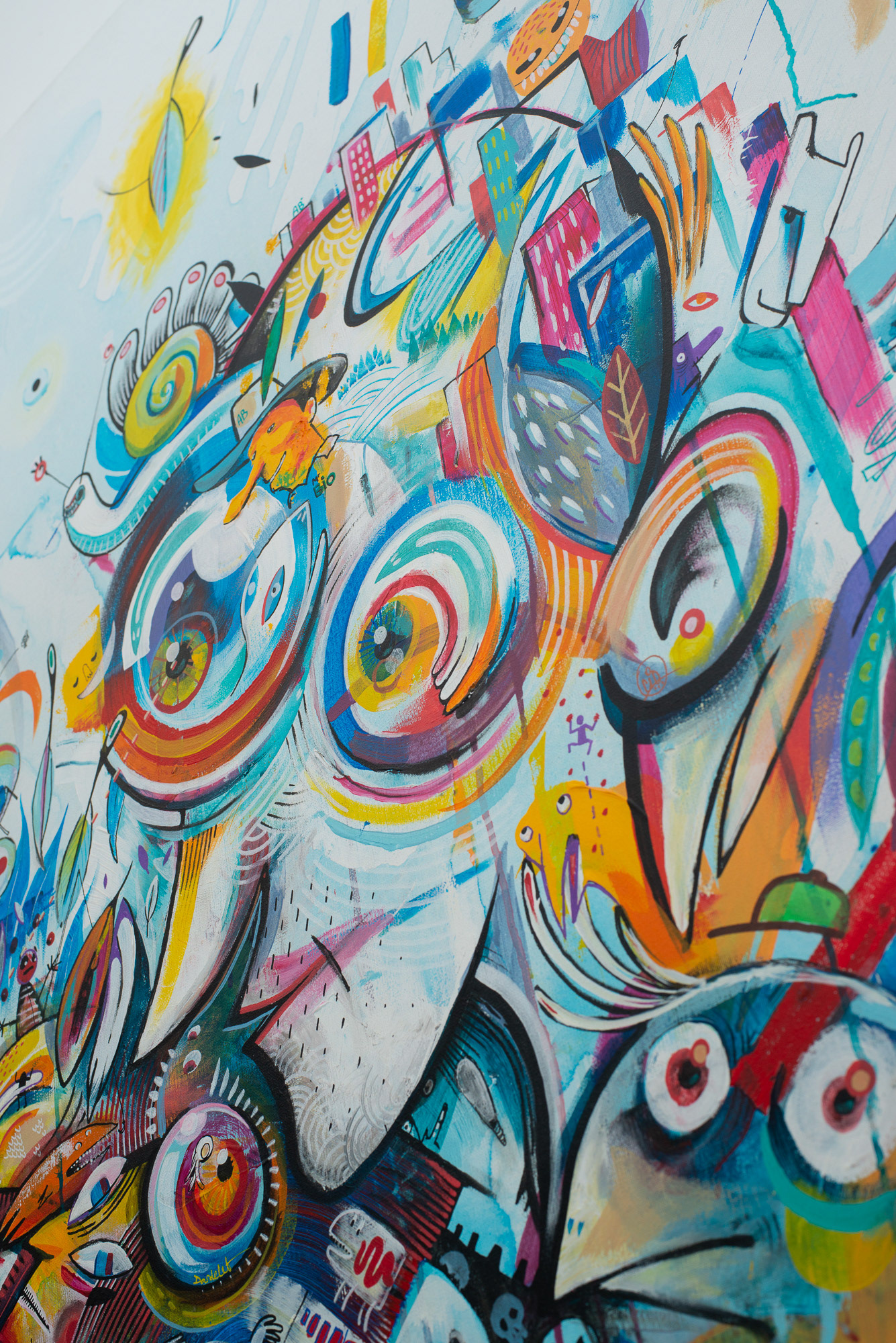 a mixed media artwork composed by three artists on a canvas 180/180cm