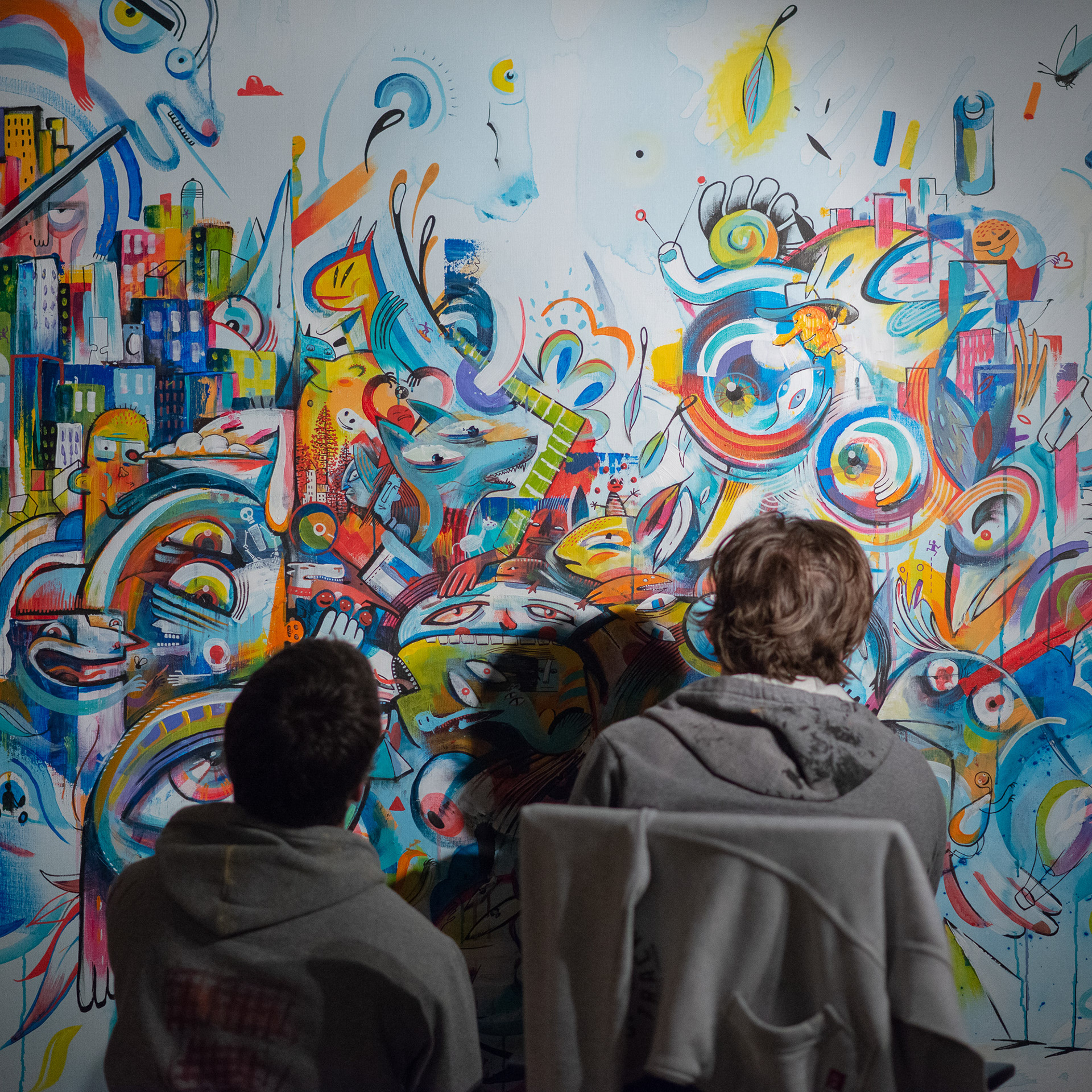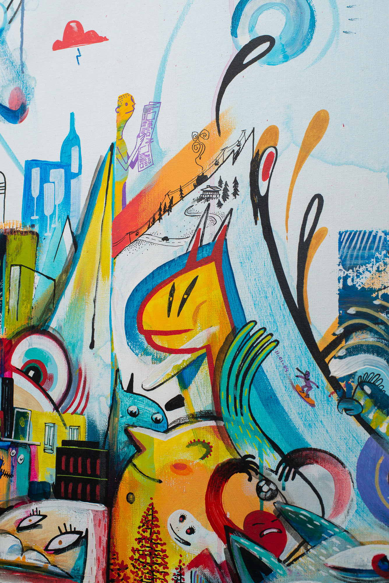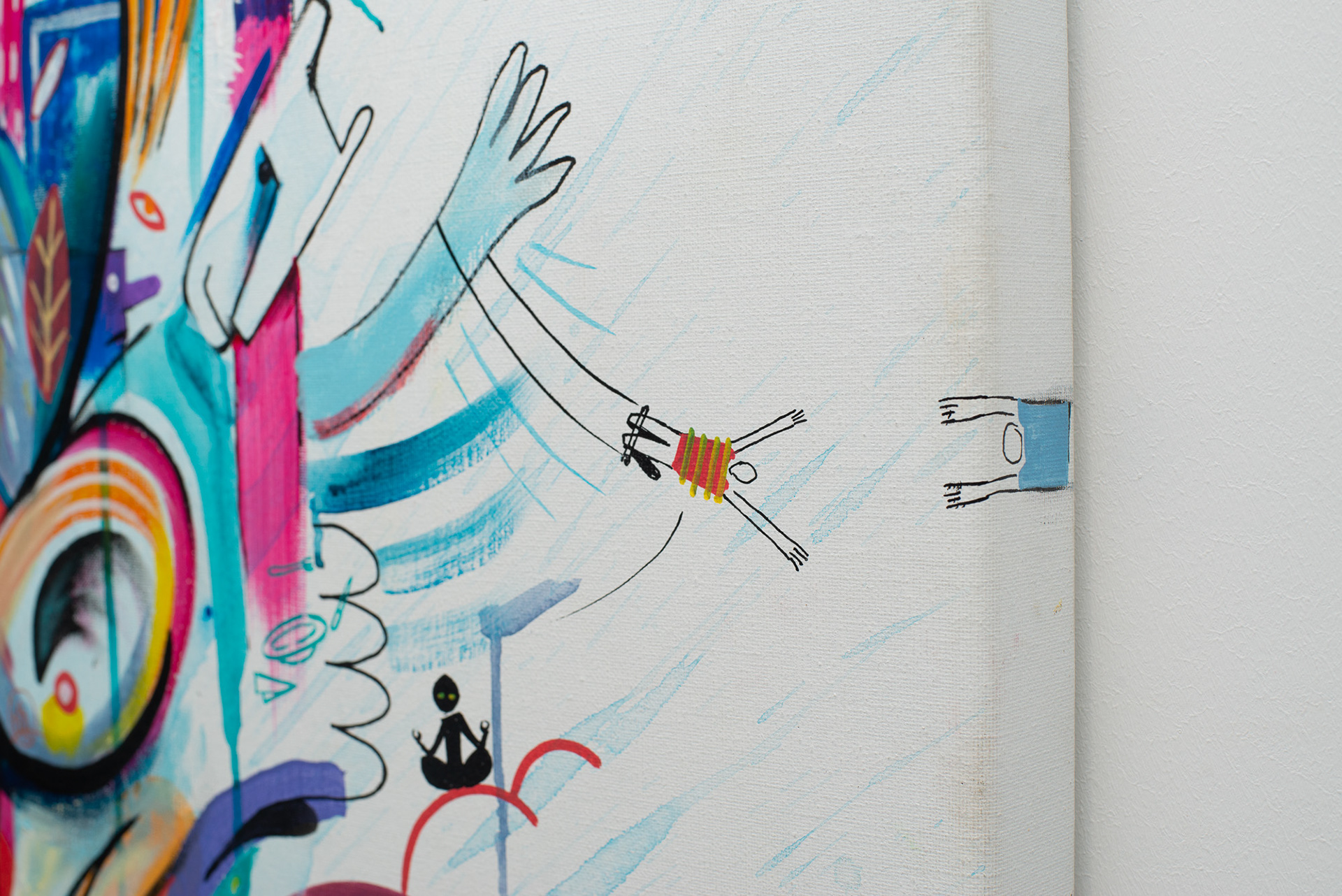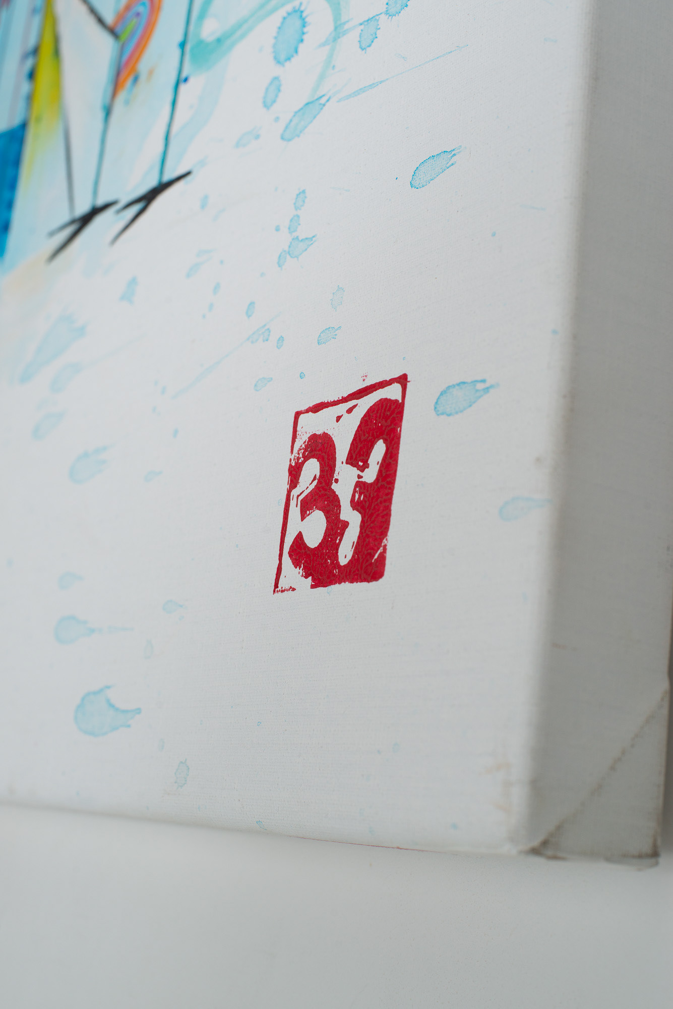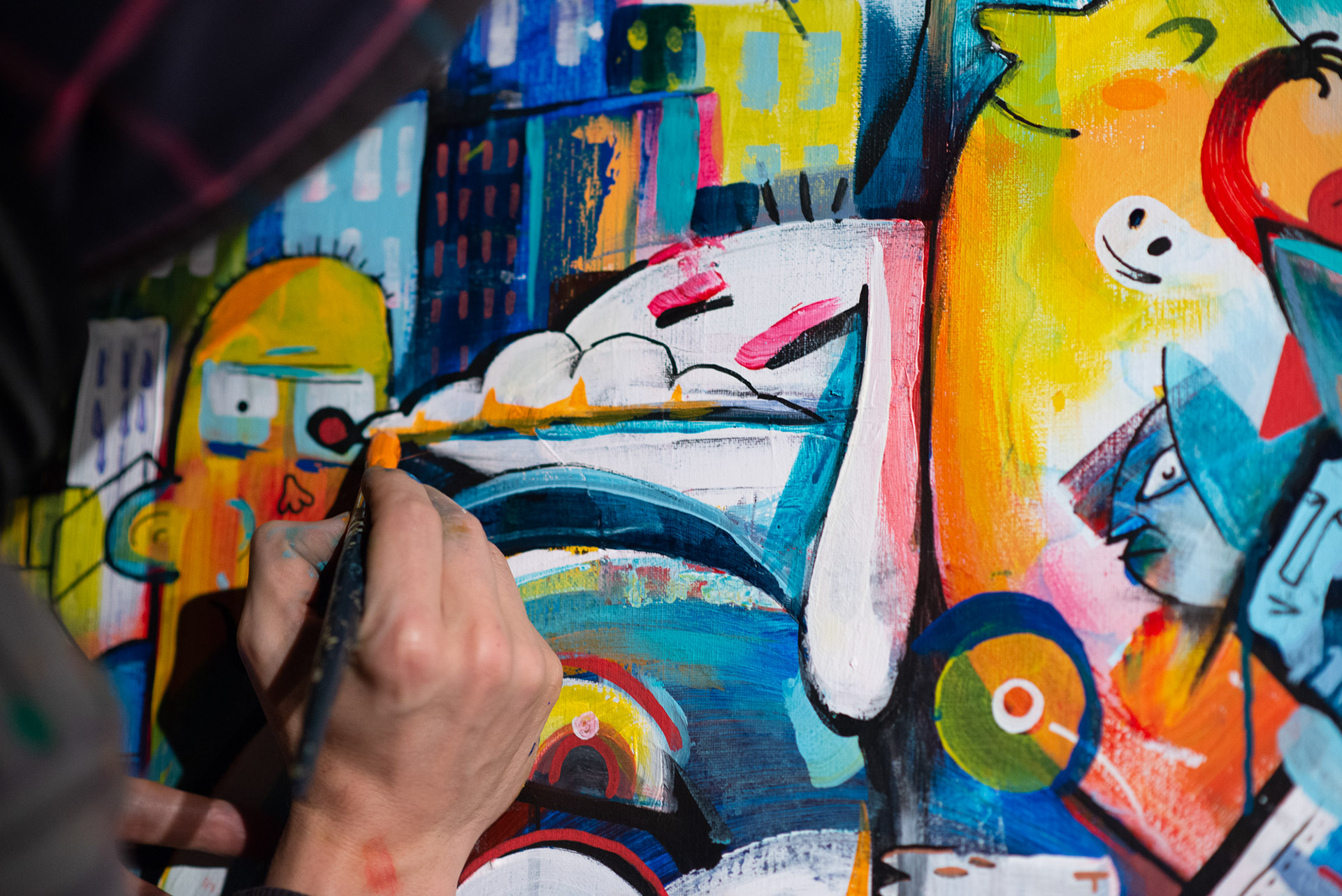 a mixed media artwork composed by three artists on a canvas 180/180cm
